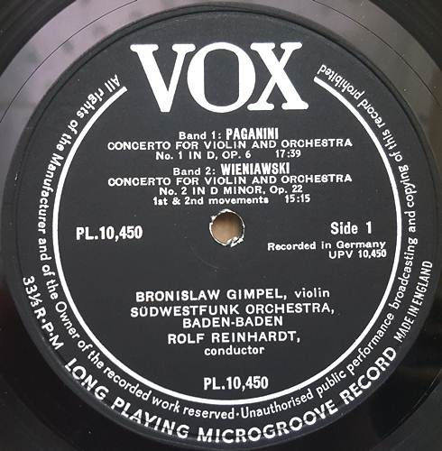 PAGANINI. WIENIAWSKI AND GLAZUNOV : VIOLIN CONCERTOS / BRONISLAW GIMPEL